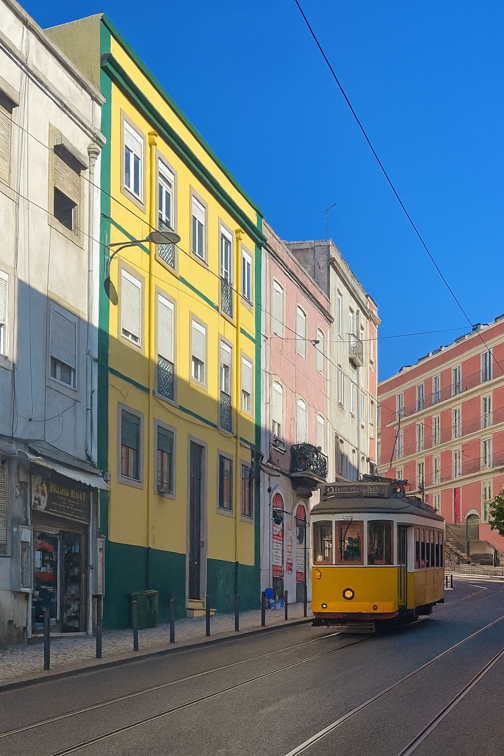 - 한 대 노란 전차가 좁은 자갈길을 끼익— 소리내며 지나가는 모습이 바로 “리스본의 엽서 사진” 그 자체다.