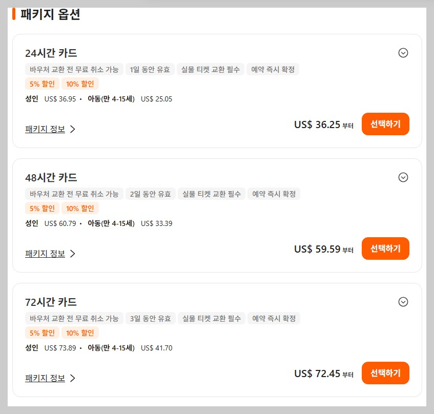 클룩에서 사면 편하다. 24/48/72 시간 중 일정에 맞는 옵션을 고르기만 하면 된다. 결제 완료 후 전자 바우처가 앱이나 이메일로 발급된다. 이 바우처를 잘 챙겨서 현지 교환처에서 실물카드로 바꾸기만 하면 끝. 포스투갈 리스본 여행이 한결 수월하다